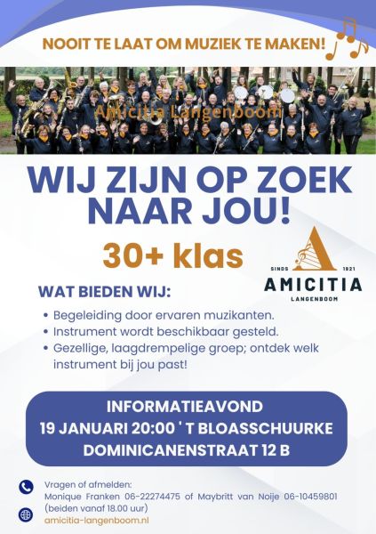 In iedereen schuilt een muzikant, ontdek je talent Voor iedereen is er op maandag 19 januari om 20:00 uur een vrijblijvende informatieavond bij Muziekvereniging Amicitia in Langenboom (locatie ´t Bloasschuurke, Dominicanenstraat 12b). Tijdens deze avond wordt uitgelegd hoe je heel laagdrempelig en vrijblijvend je muzikale talent kunt ontdekken. Quote van een bezoeker na een editie van Langenboom Live: "Wat een fantastische avond vol muziek, zo jammer dat ik geen muziek kan maken!" Goed te weten dat er muzikanten bij zitten die slechts twee jaar bij Muziekvereniging Amicitia muzieklessen volgen. Het is nu tijd om zelf te ervaren dat je wel degelijk muziek kunt maken, het is een kwestie van beginnen! Muziekvereniging Amicitia start binnenkort met editie 3 van de 30+ klas. Twee edities zijn succesvol verlopen met een diversiteit aan deelnemers. Deelnemers die vroeger muziek gemaakt hebben en, nu de kinderen groter zijn, een ander instrument bij een vereniging willen leren spelen. Deelnemers die vroeger thuis de kans niet gekregen hebben om muziek te leren maken. Deelnemers die nog voor hun pensioen alvast een mooie hobby toe willen voegen aan hun leven. Ouders die samen met kinderen muzieklessen willen volgen (over quality time met je kind gesproken). Tientallen 30+ muzikanten zijn met veel plezier inmiddels onderdeel geworden van Muziekvereniging Amicitia. Als je twijfelt of muziek maken iets voor je is kunnen we je maar één advies geven: "stop met twijfelen en ga ontdekken!" Kom op zijn minst naar de informatieavond op 19 januari. Je krijgt daar uitleg over het concept 30+ klas en oud deelnemers zullen hun ervaringen met je delen en je vragen beantwoorden. Je kunt instrumenten uitproberen en zult ontdekken dat je direct een klik kunt hebben met een instrument en met een ander instrument veel minder. Voor iedere volwassene is het mogelijk om deel te nemen aan deze muziekopleiding zonder direct een grote financiële investering te moeten doen. Laat deze kans niet voorbijgaan en kom kijken, luisteren en proberen. Amicitia verzorgt alles inclusief een drankje. Aanmelden is niet nodig. Muziek in je leven is een verrijking - als olie in een motor - , alles loopt soepeler! Bij vragen, of kun je niet aanwezig zijn, bel dan naar Monique Franken 06-22274475 of Maybritt van Noije 06-10459801 (beiden vanaf 18:00 uur).